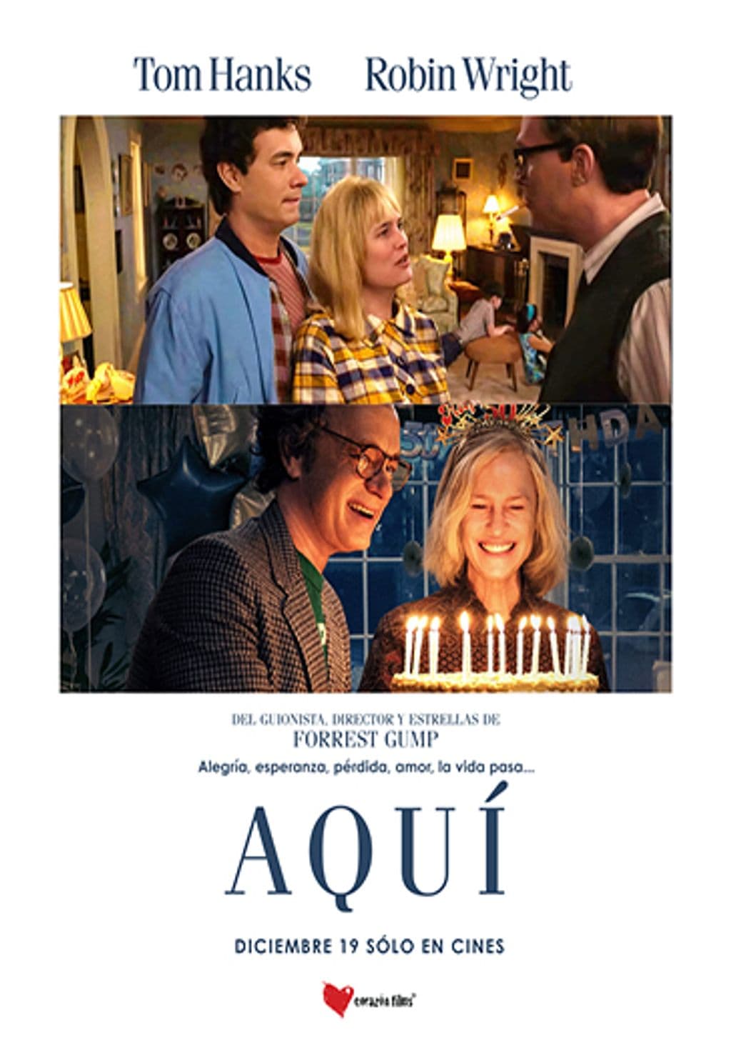 AQUÍ sigue a varias familias de diferentes generaciones que hicieron de esa habitación su hogar. Una historia de amor, pérdida, risas y vida, que nos hará viajar desde un pasado muy remoto hasta un futuro próximo. Un viaje a lo largo de cientos de miles de años que transcurre, de principio a fin, en un solo lugar: aquí. Protagonizada por Tom Hanks, Kelly Reilly, Michelle Dockery, Robin Wright y Paul Bettany. Dir. Robert Zemeckis (Forrest Gump, Volver al futuro, entre otras). Basada en la Novela gráfica "Here".