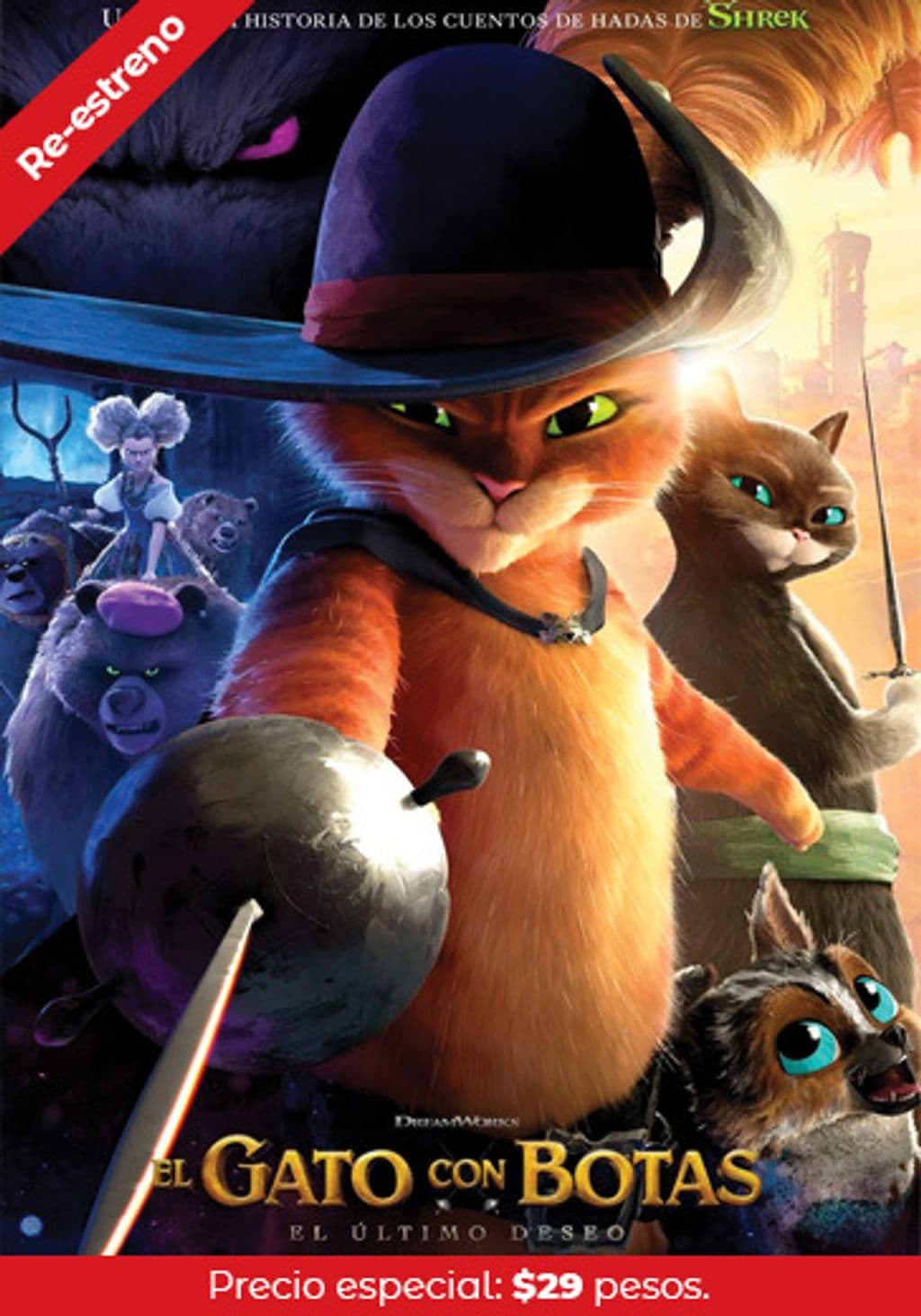 DreamWorks Animation presenta una nueva aventura en el universo de Shrek en la que el valiente forajido Gato con Botas descubrirá que su pasión por el peligro y su desprecio por la seguridad le han pasado factura. Gato ha gastado ocho de sus nueve vidas, aunque perdió la cuenta en el camino. Recuperar esas vidas llevará al Gato con Botas a su búsqueda más increíble hasta el momento.